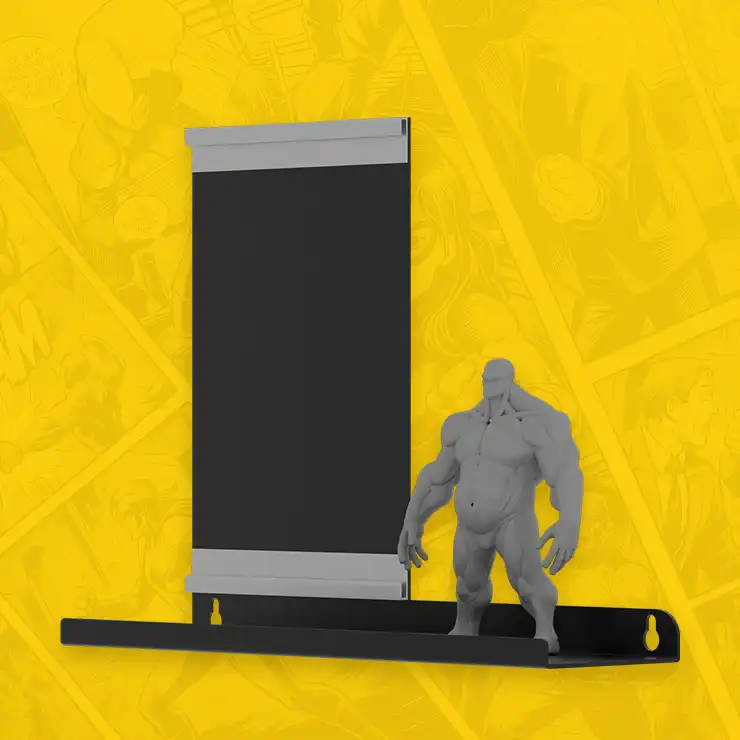 Show off you favorite hero or collectible in a new way with your favorite background. Made of heavy-duty .063 powder-coated aluminum and tracked for an 8 x 10 print, photo, drawn, or painted design. Anything you can imagine. The display can hang on the wall or sit on a flat surface and is designed to hold up to 2 pounds. It also has rubber bumpers on the bottom and back to keep your surface safe. Collectibles and backgrounds are not included but are available in our accessory section.